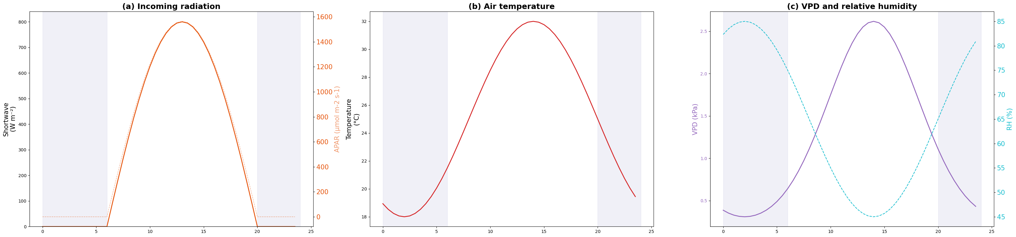 print(f" PAR peak: {forcings['par'].max():.0f} W/m²")Forcing summary:
