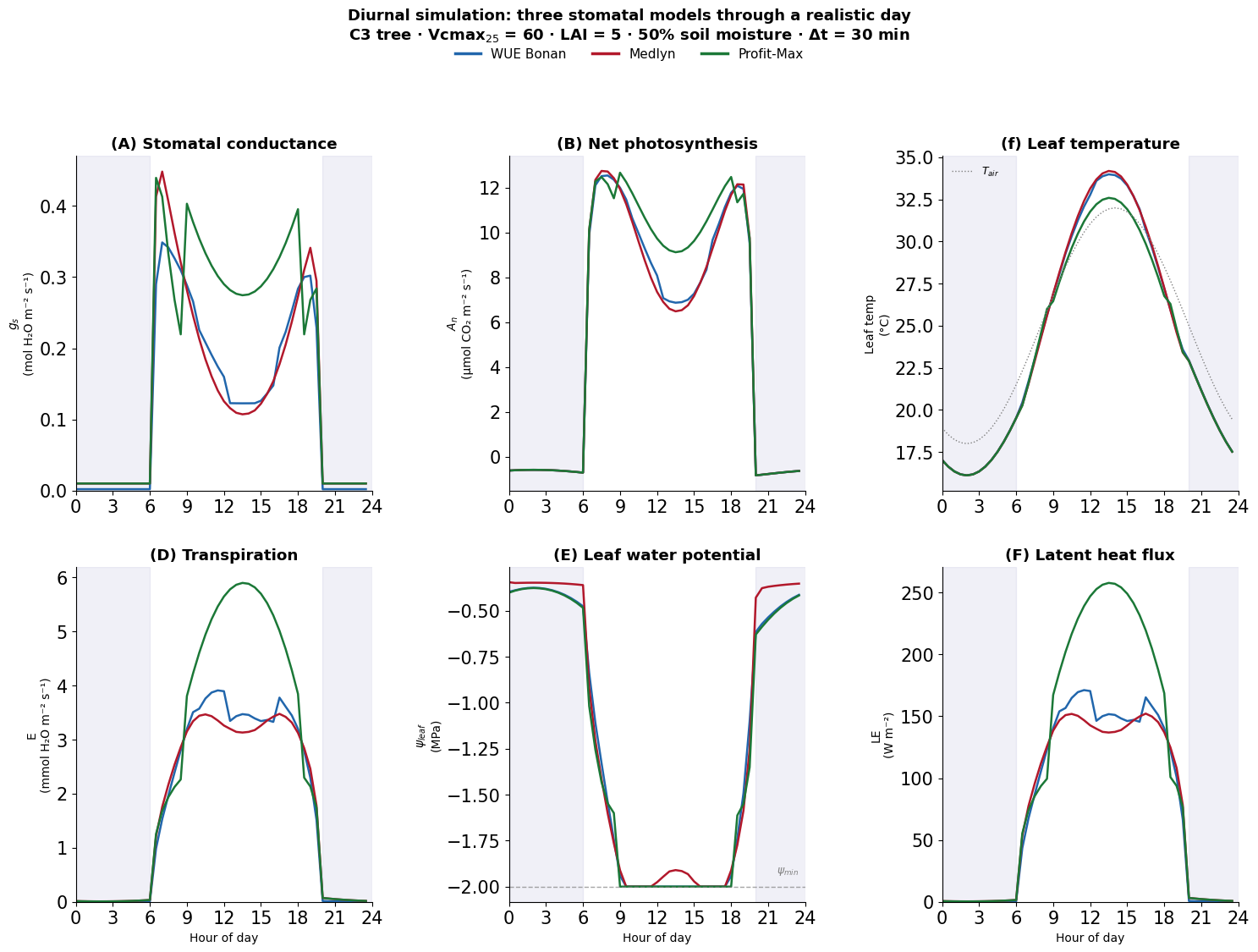 from plant_hydraulics.utils import diurnal_temperature, diurnal_par, diurnal_relhumTutorial 2: Stomatal model comparisons